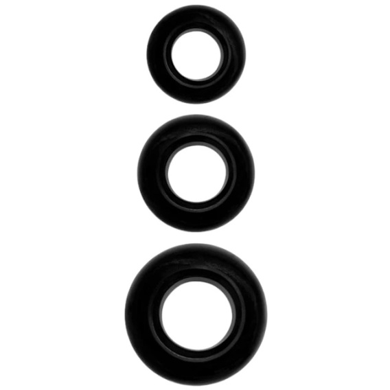 Trójpak pierścieni na penisa, wykonanych gumy termoplastycznej (TPR).