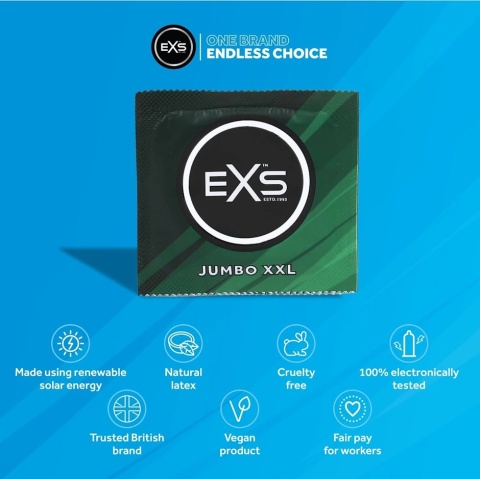 EXS XXL Jumbo to prawdopodobnie największe prezerwatywy na rynku. Zaprojektowane z powiększoną szerokością dla hojnie obdarzonych mężczyzn, aby mogli doświadczać wygodniejszego dopasowania.