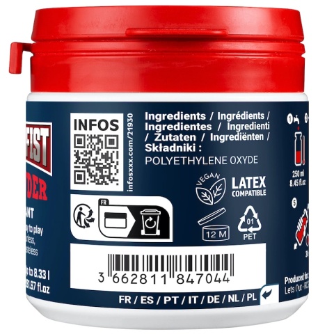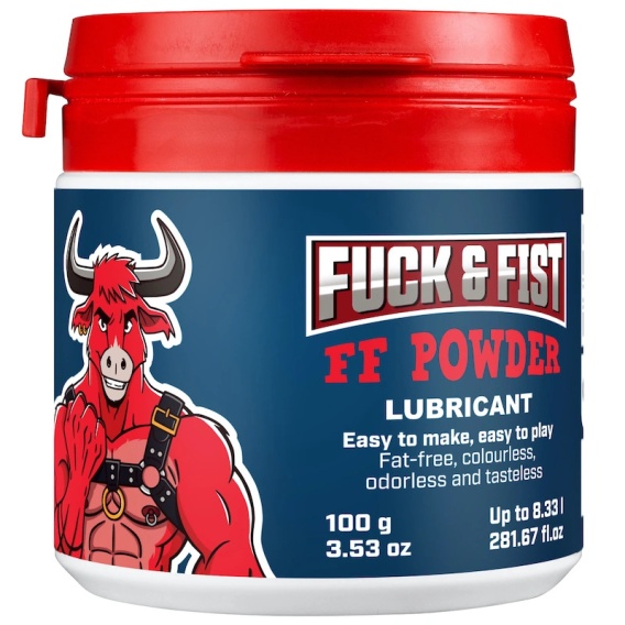 Fuck & Fist FF Powder jest wysokowydajnym koncentratem żelu do fistingu, w postaci proszku. Składnikiem jest polimer PEO (polyethylene oxide - tlenek polietylenu), który łatwo rozpuszcza się w wodzie.