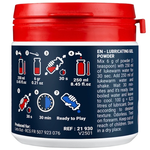 Do 250 ml gorącej wody wsyp 1 łyżeczkę (6 gram) proszku i wstrząsaj przez 30 sekund. Ponownie dodaj 250 ml gorącej wody i wstrząsaj przez 30 sekund. Po 30 minutach żel jest gotowy do użycia. Sam decydujesz o gęstości gotowego lubrykantu do fistowania - możesz zmieniać proporcje wg uznania.