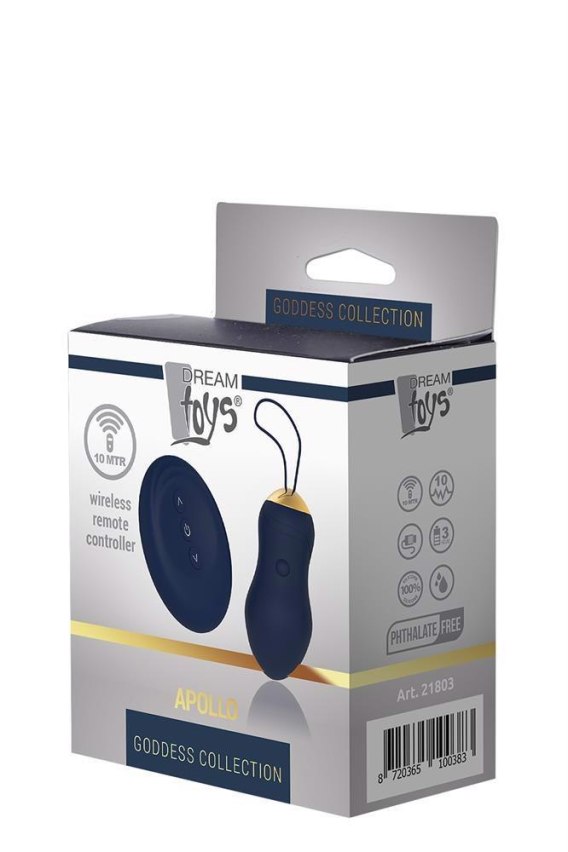 Apollo to wibrujące jajko z pilotem. Doskonały do ??wewnętrznej stymulacji dzięki łatwej obsłudze i mocnemu sznurkowi do łatwego wyjmowania. Jajko Apollo ma wyrafinowany wygląd dzięki gładkiemu kształtowi, ciemnoniebieskiemu silikonowi i złotym detalom. To jajko przyjemności oferuje 7 rytmów wibracji z 3 prędkościami, więc zawsze istnieje wibracja dostosowana do potrzeb użytkownika. Wibracje można łatwo regulować podczas użytkowania za pomocą przycisków strzałek na bezprzewodowym pilocie zdalnego sterowania o zasięgu 10 metrów. Zarówno jajko, jak i pilot można ładować za pomocą dołączonego kabla USB.