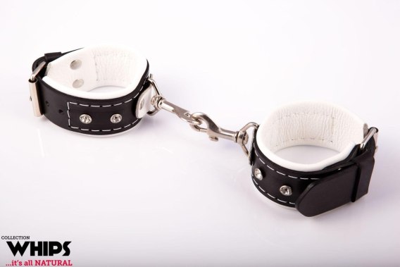 Skórzane kajdanki w kolorze biało-czarnym zapinane na masywne klamry. Możliwość regulacji rozmiaru.