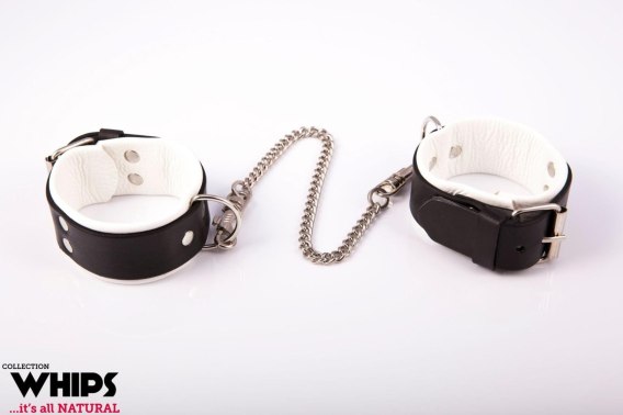 Skórzane kajdanki męskie na ręce w kolorze białym zapinane na masywne klamry. Możliwość regulacji rozmiaru.