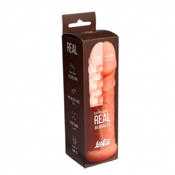 Real Extra Size to nakładka, która zwiększa długość penisa o 3 cm, dodając nową jakość doznań w intymnych chwilach. Miękki, elastyczny pierścień mocujący zapewnia stabilność nakładki i komfort użytkowania, zapobiegając zsunięciu się podczas zbliżenia. Dwustronna faktura - realistyczna na zewnątrz i stymulująca bąbelkami wewnątrz - dostarcza przyjemnych bodźców dla obu partnerów. Dzięki wygodnemu wewnętrznemu uszczelnieniu, nakładka idealnie przylega, dając realistyczne odczucia - odbierana jest przez partnera jako naturalne przedłużenie penisa.