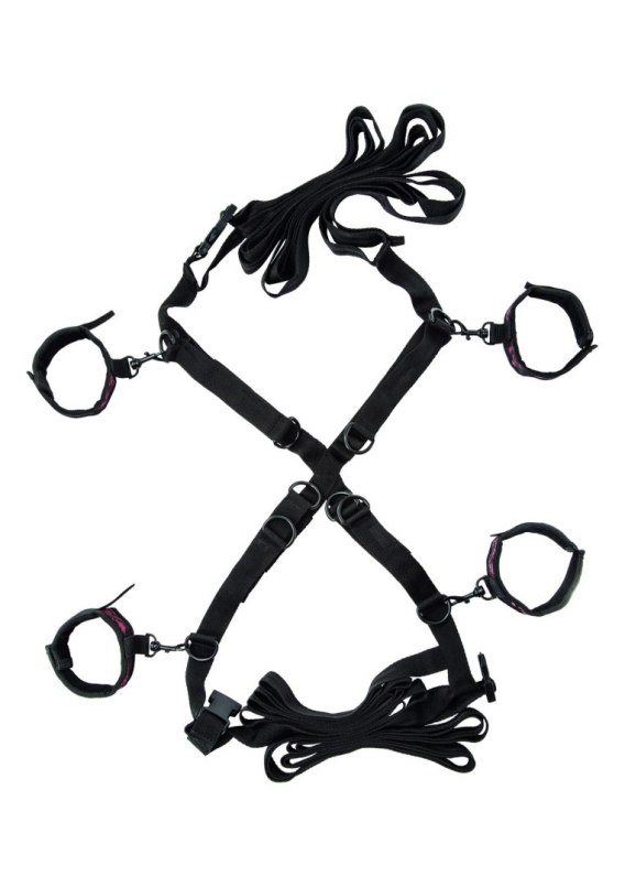 Przypnij mocno swojego kochanka do łóżka i spełnij jego najskrytsze pragnienia dzięki Scandal Over the Bed Cross. Mocne paski są w pełni regulowane, aby pasowały do ??każdego rozmiaru łóżka. Uniwersalne klamry i pierścienie mają obrotową konstrukcję, dzięki której zmiana pozycji w upale chwili zajmuje kilka sekund. Jako dominujący pokochasz widok swojego partnera rozłożonego na łóżku, całkowicie unieruchomionego przez te niezniszczalne ograniczenia. Twoja uległość będzie mogła patrzeć i jęczeć z pożądania, kiedy całujesz, drażnisz i pieścisz aż do ekstazy. Jako uległy pokochasz pośpiech polegający na zaufaniu partnerowi do robienia dokładnie tego, co mu się podoba i wszystkiego, co doprowadza Cię do szaleństwa. Miękkie, pluszowe mankiety nadgarstka i kostki zapewnią ci wygodne wiązanie, bez względu na to, jak mocno skręcisz i pociągniesz ograniczenia. Krzyżowy krój sprawia, że ??jesteś całkowicie narażony na podziwiające spojrzenie i pożądliwe dłonie swojego kochanka, co zapewnia najwyższą przyjemność. Twoja dominująca osoba może zacisnąć paski, aby rozłożyć nogi tak daleko od siebie, jak odważysz się odsłonić wszystko i dać im dostęp do wszystkich najbardziej wrażliwych miejsc. Niezwykle seksowna wyprawa do świata odgrywania ról i obiecująca wyjątkowy i niegrzeczny wieczór gry zarówno dla dominującej, jak i uległej strony.